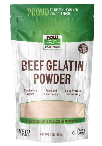NOW Real Food 100% Pure Beef Gelatin is a natural thickener, stabilizer and texturizer that mixes instantly – no soaking necessary. Gelatin is commonly used in jams, jellies, gelatin desserts, marshmallows, and many other foods. It’s often used to create volume without adding a lot of calories.