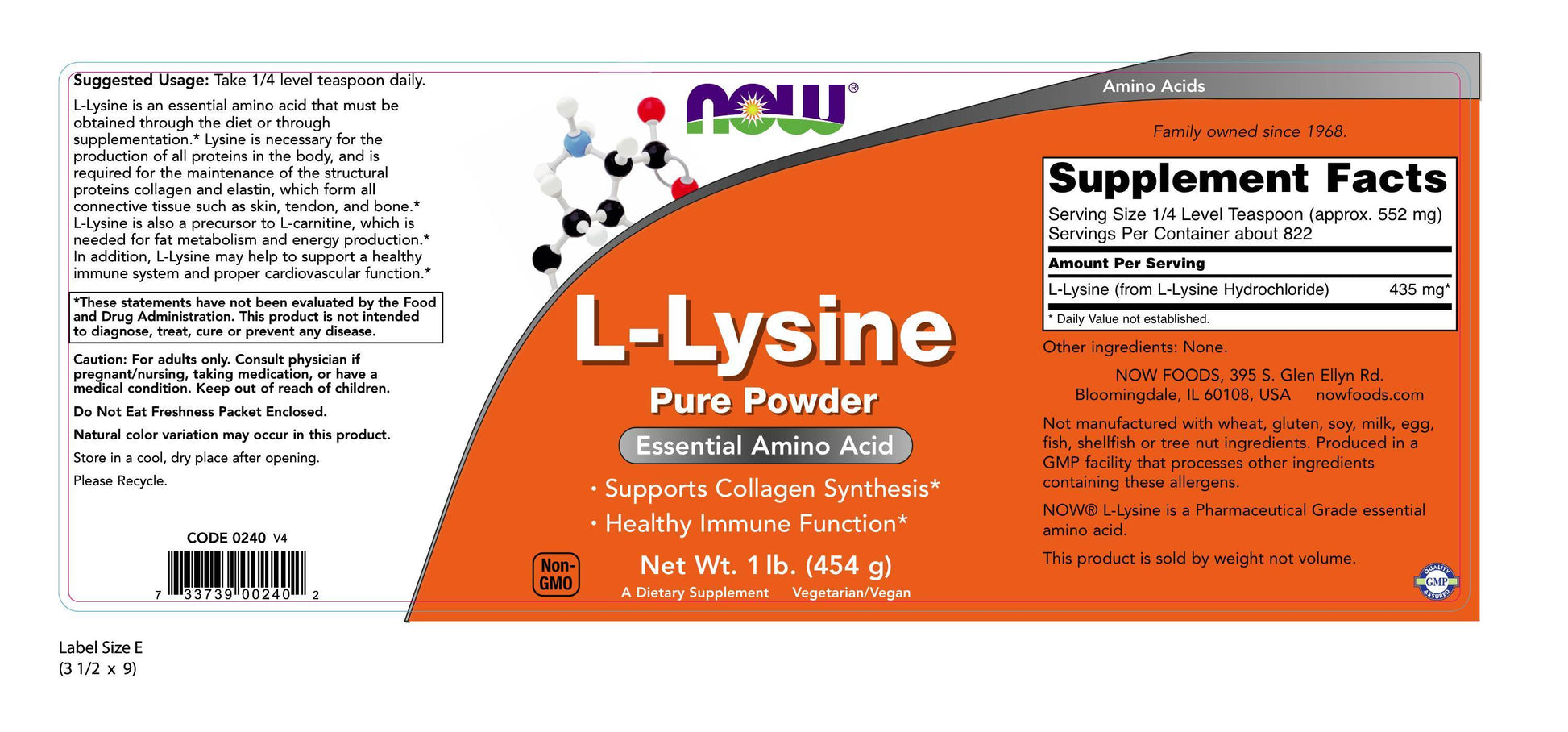 NOW L-Lysine is a Pharmaceutical Grade essential amino acid.