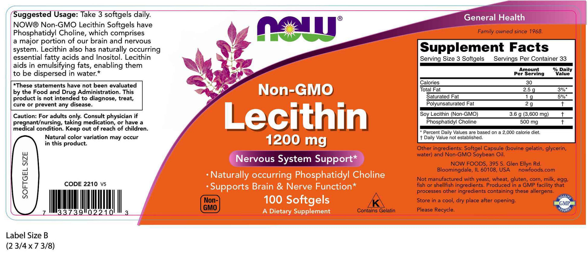 NOW Non-GMO Lecithin Softgels have 15% Phosphatidyl Choline, which comprises a major portion of our brain and nervous system. Lecithin also has naturally occurring essential fatty acids and Inositol. Lecithin aids in emulsifying fats, enabling them to be dispersed in water.