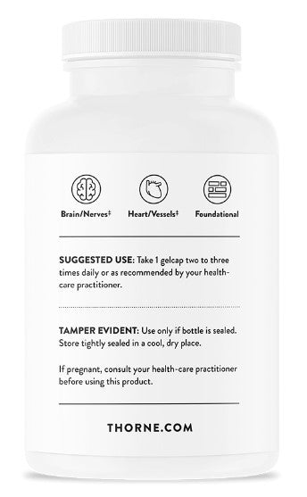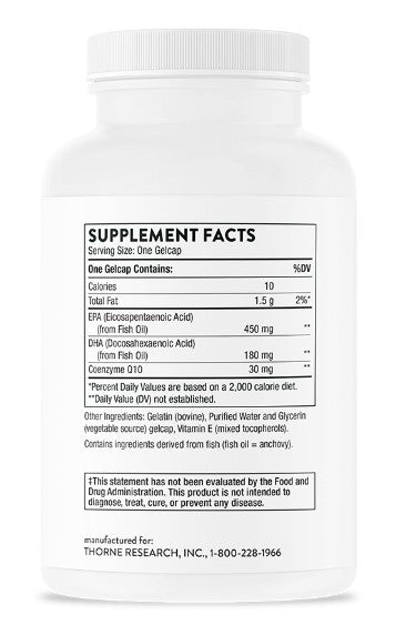 Thorne’s Omega-3 with CoQ10 contains the two most vital omega-3 fatty acids from fish – EPA and DHA – combined with Coenzyme Q10 (CoQ10) for synergistic support and enhanced absorption.*