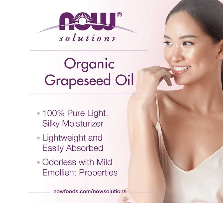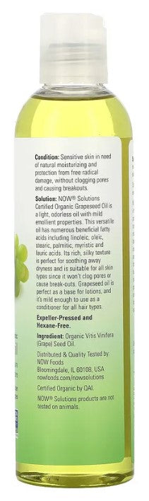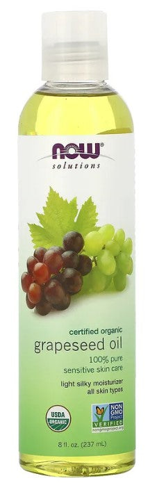 Solution: NOW® Solutions Certified Organic Grapeseed Oil is a light, odorless oil with mild emollient properties. This versatile oil has numerous beneficial fatty acids including linoleic, oleic, stearic, palmitic, myristic and lauric acids. Its rich, silky texture is perfect for soothing away dryness and is suitable for all skin types since it won't clog pores or cause break-outs. Grapeseed Oil is perfect as a base for lotions, and it's mild enough to use as a conditioner for all hair types.