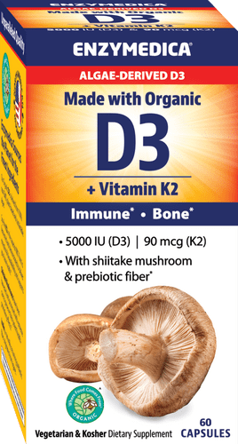 40% of the population is Vitamin D deficient. Enzymedica’s Vitamin D3 includes Vitamin K2, shiitake mushrooms, and inulin for three benefits in one!* Vitamin D3, or cholecalciferol, is essential for multiple health benefits, including strong bones and strong immune and cardiovascular systems.* Enzymedica’s Made with Organic D3 supplement uses the preferred form of Vitamin D, D3, which is algae derived and organic.