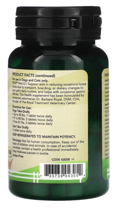 NOW® Pets G.I. Support aids in reducing occasional loose stools due to transport, boarding, or dietary changes to your pet's daily routine, and helps with occasional gastric distress. This health supplement has been formulated by renowned veterinarian Dr. Barbara Royal, DVM, CVA, founder of the Royal Treatment Veterinary Center.
