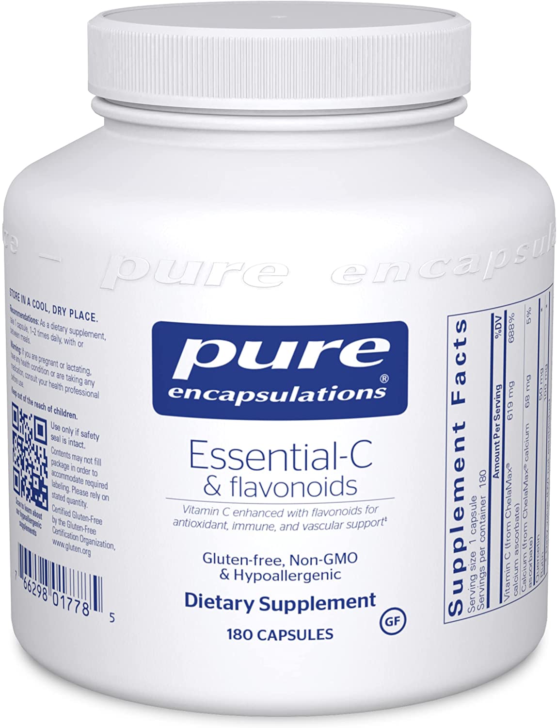 Essential-C and flavonoids is a blend of vitamin C and various flavonoid compounds to provide enhanced vitamin C support. Essential-C and flavonoids helps maintain a healthy immune system as well as support to blood vessel integrity and healthy cell function.