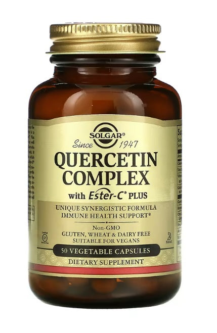 Solgar® Quercetin Complex includes the important bioflavonoid Quercetin in a synergistic formula with Ester-C® Plus to provide unique antioxidants as well as immune health support. Quercetin is found in onions and other foods. It possesses antioxidant properties which help to stabilize cell membranes. Ester-C® Plus provides a unique, pH neutral (non-acidic), form of vitamin C that is gentle on the stomach. Ester-C® Plus offers the additional benefits of incorporating acerola berry, citrus bioflavonoids, rutin and rose hips. This formula also features bromelain, a natural enzyme derived from pineapple.