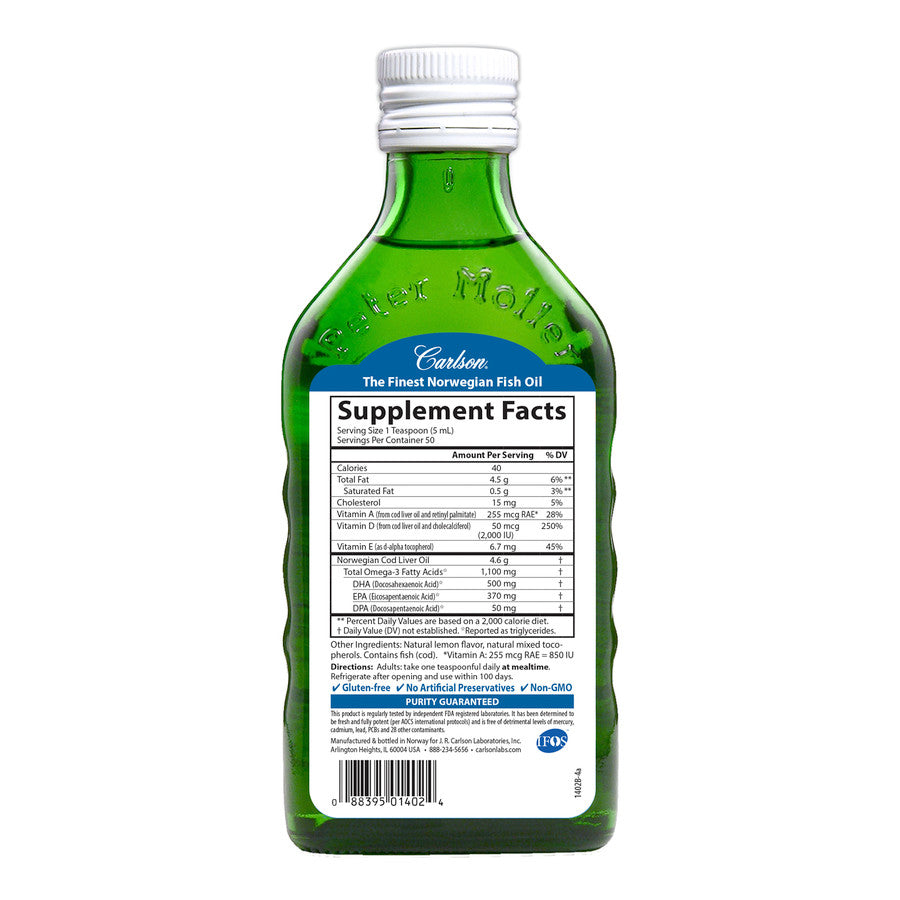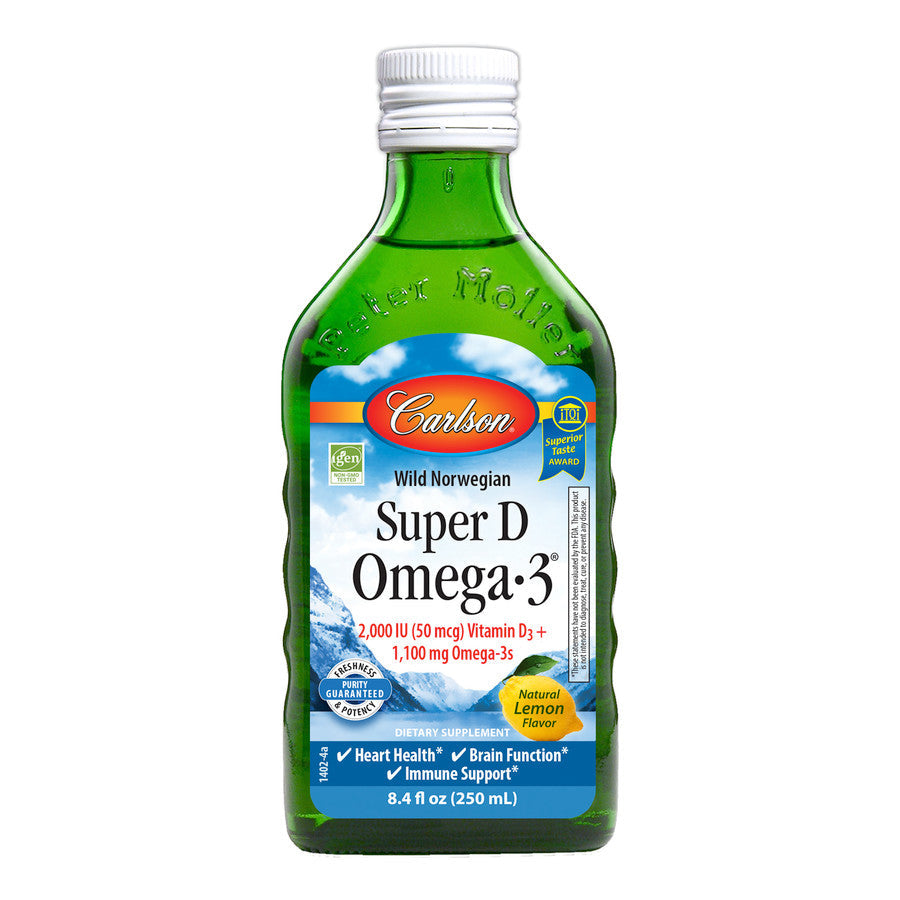 Carlson Super D Omega-3® is a highly concentrated, balanced, professional-strength omega-3 supplement with a delicious, award-winning lemon flavor. It offers 2,000 IU of vitamin D3 and 1,100 mg of omega-3s per teaspoonful, including the most important omega-3s EPA and DHA. To ensure maximum freshness, Super D Omega-3® is closely managed from sea to store. We source the highest quality, deep, cold water fish using traditional, sustainable methods. Our fish are then transported to a highly-regulated Norwegian facility for processing and purification. The fish oil is bottled with a touch of vitamin E and is given a nitrogen flush to remove oxygen and help prevent oxidation. Like all Carlson omega-3s, freshness, potency, and purity are guaranteed.