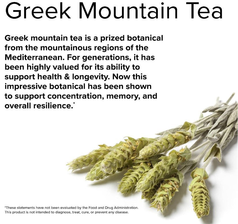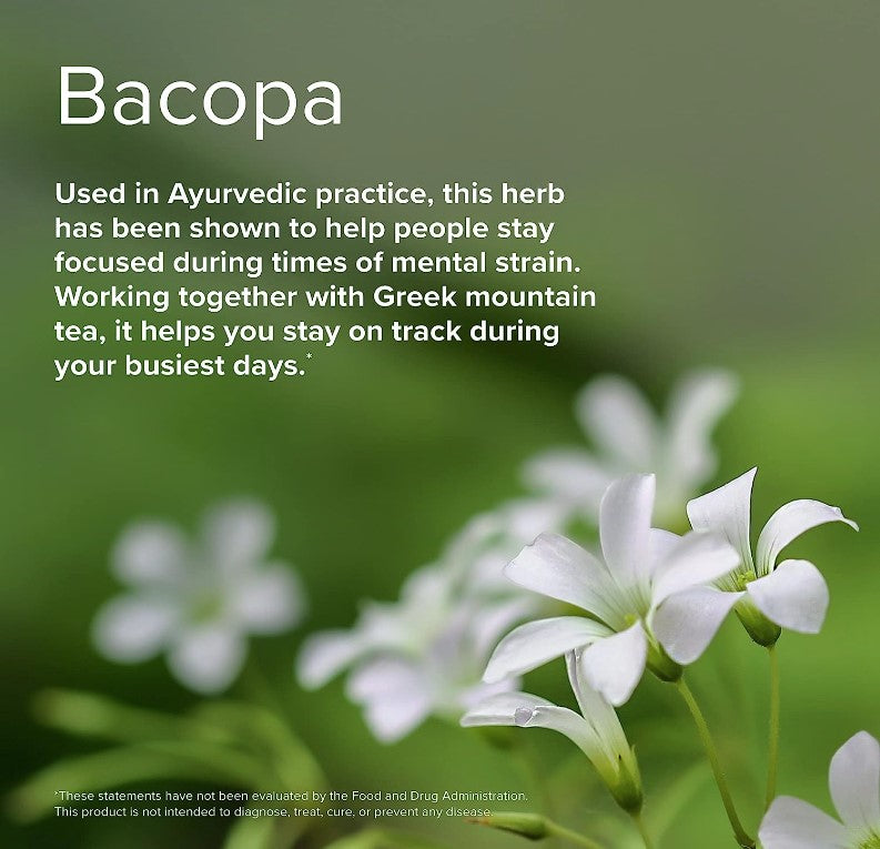 Greek mountain tea (Sideritis scardica) is a prized botanical from the mountainous regions of the Mediterranean. For generations, it has been highly valued for its ability to support health and longevity. Now this impressive botanical has been clinically studied to support concentration, mood, memory, and overall resilience.*Bacopa (Bacopa monnieri), a long-trusted herb used in Ayurvedic practice, has been shown in clinical research to help people stay focused during times of stress.*^