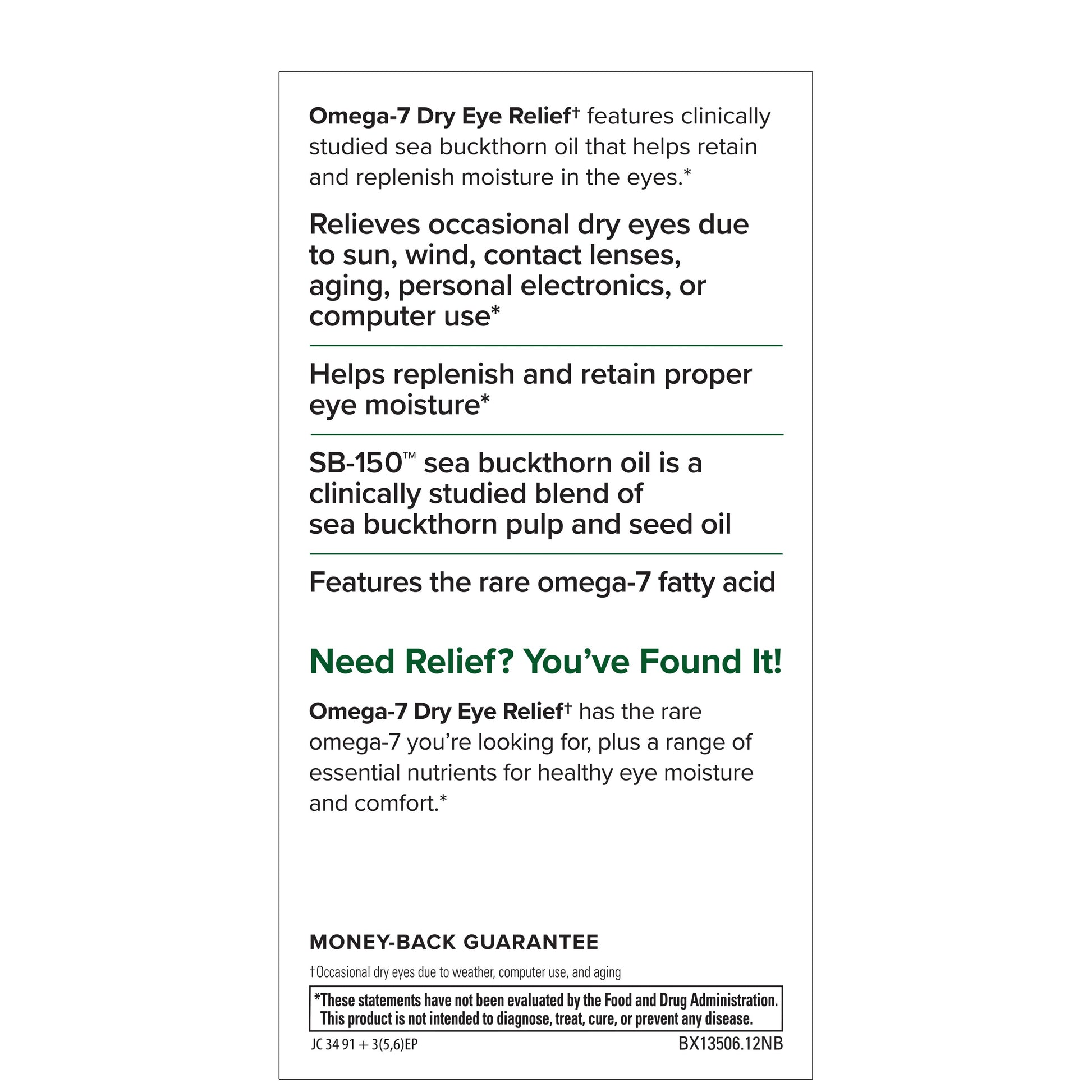 Omega7 Dry Eye Relief† features clinically studied sea SBA24 buckthorn oil that helps retain and replenish moisture in the eyes.