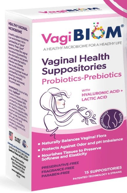 Natural Vaginal pH and Odor control suppository with patented VagiBiom® Probiotics (Lactobacillus crispatus Bi19, Lactobacillus gasseri Bi14), prebiotics, and hyaluronic acid. Balances and nurture vaginal microbiome against bad infections and inflammation.