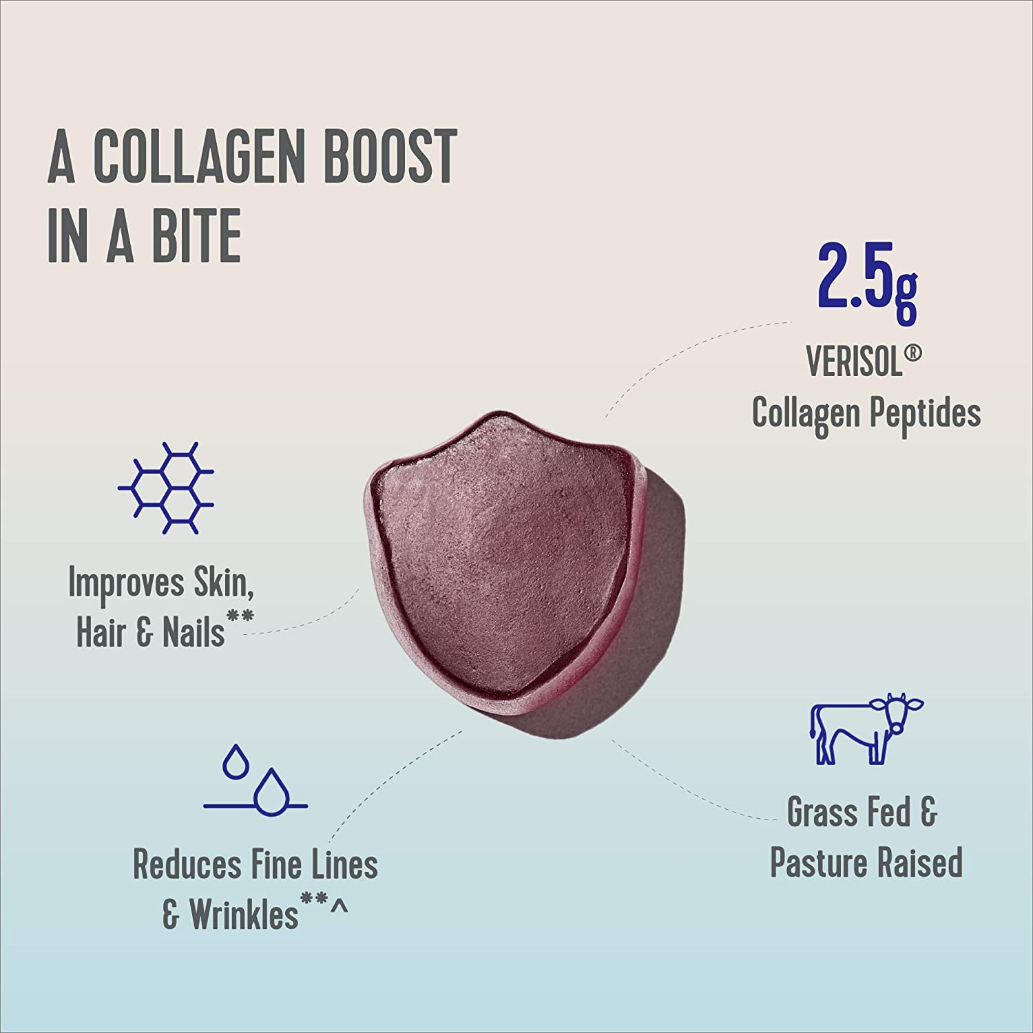Collagen, meet gummies. Shield your wellness with our convenient, grape-flavored Collagen Gummies. Enjoy a bite-sized wellness boost that helps improve skin, hair & nails** and reducing fine lines & wrinkles.**^ ^After 8 weeks of supplementation with VERISOL ® bioactive collagen