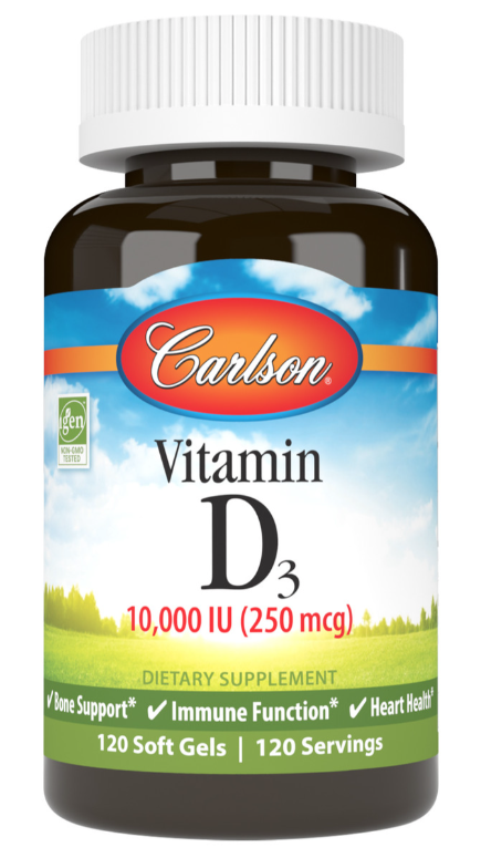 Carlson Vitamin D3 10,000 IU (250 mcg) is the preferred form of vitamin D that's important for promoting strong bones and supporting immune system and heart health. Higher levels of vitamin D3 in the blood are associated with strong bones and good health, as well as a strong immune system. Each soft gel provides 10,000 IU (250 mcg) of vitamin D3.
