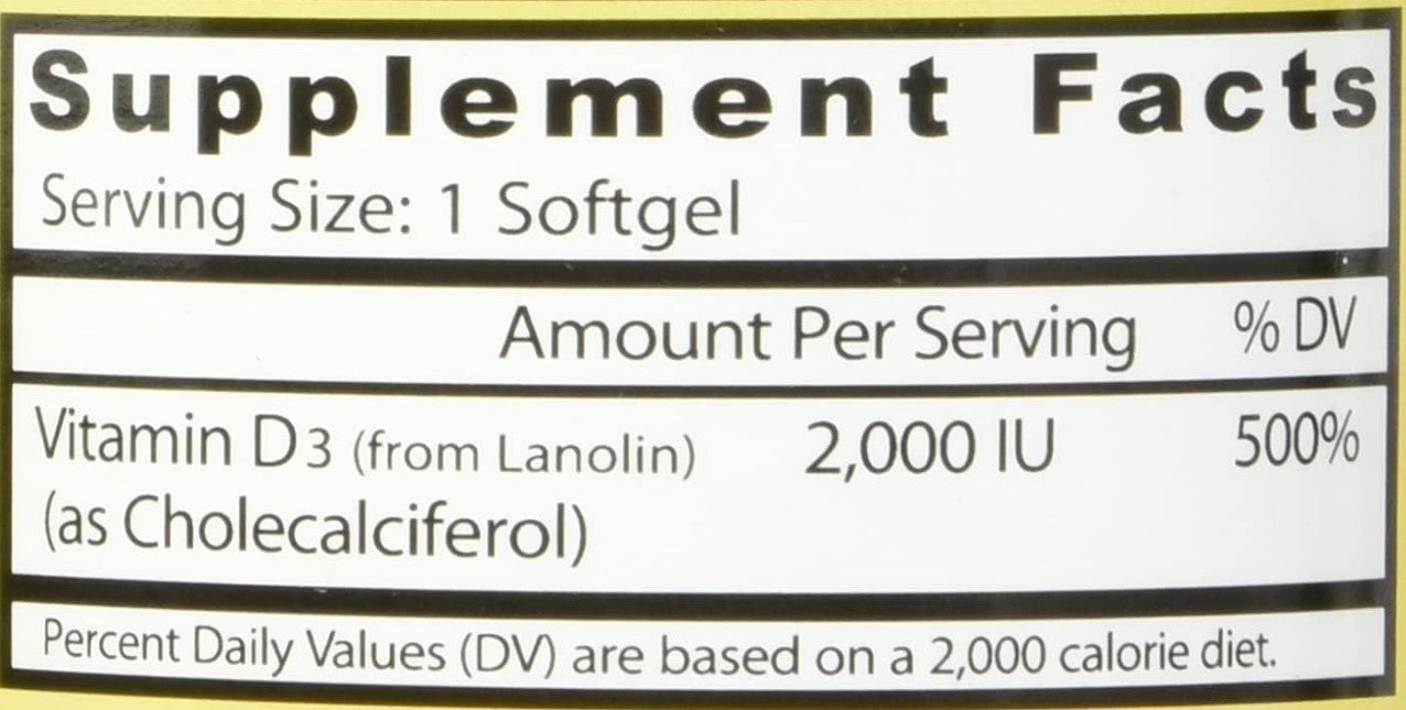 - 2,000 IU vitamin D3 (500% DV) per softgel