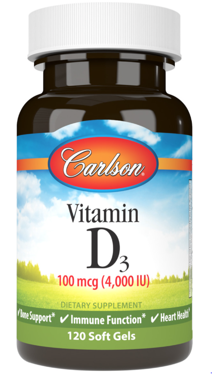 Carlson Vitamin D3 4,000 IU (100 mcg) is the preferred form of vitamin D that's important for promoting strong bones and supporting immune system and heart health. Higher levels of vitamin D3 in the blood are associated with strong bones and good health, as well as a strong immune system. Each soft gel provides 4,000 IU (100 mcg) of vitamin D3.