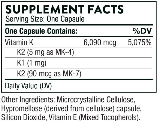Vitamin K supports the healthy ability of the blood to clot, promotes healthy arteries, and supports healthy bone density. However, there are three types of vitamin K, and each one is responsible for different benefits. Thorne’s Vitamin K is a complete formula that includes vitamin K1 and two forms of vitamin K2.